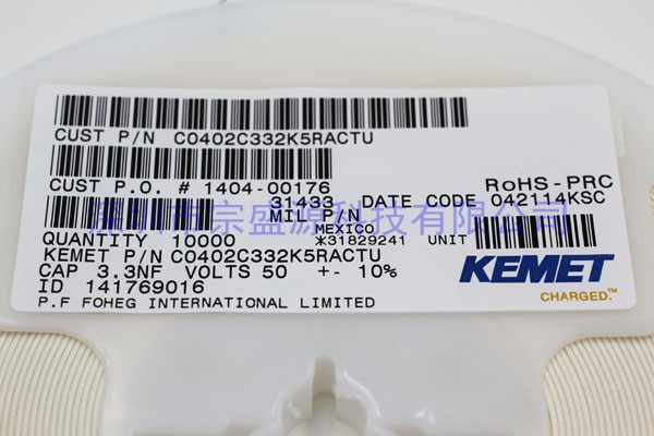 產(chǎn)品名稱:KEMET電容 0402 50V 3.3NF C0402C332K5RACTU