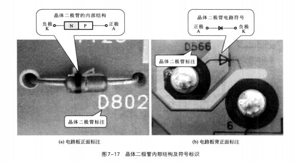 可以看到,D802和D566即為晶體二極管。由于晶體二極管有極性的區分,對于小功率晶體二極管來說,如圖7-17(a)所示,在晶體二極管的表面,靠近左端的引腳有一個色環標注,這表明該端引腳為晶體二極管的K極(負極),另一端即為晶體二極管的正極。此外,在電路板上,有時也可以通過晶體二極管的電路符號標注來判別晶體二極管及其引腳極性。如圖7-17(b)所示,在電路板的背面,可以通過"D566"來判別這是一個晶體二極管,而通過