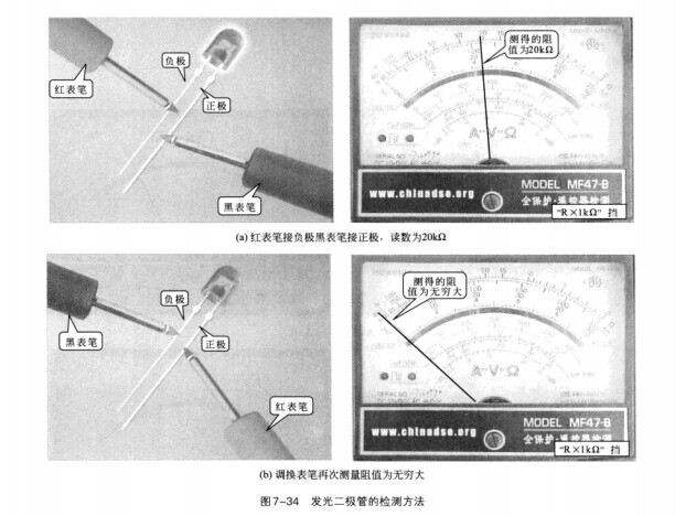 發(fā)光二極管的檢測操作見圖7-34。